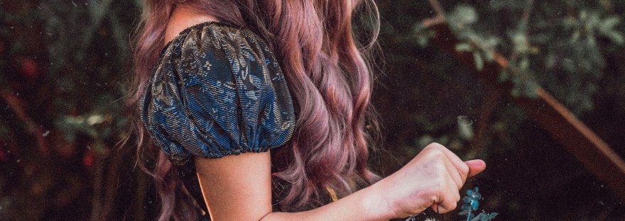 A girl with curly red hair, seen in profile, wearing a sparkly black and gold dress and black witch hat, carrying a small pumpkin shaped bucket with plants inside.