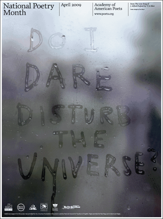 My favorite of the official National Poetry Month posters (though this poem reminds me of high school chemistry class, the teacher was a frustrated poet, I think, better that than a self-identified Prufrock) As usual, pictures are links to their sources.