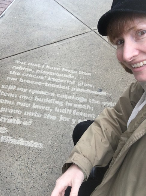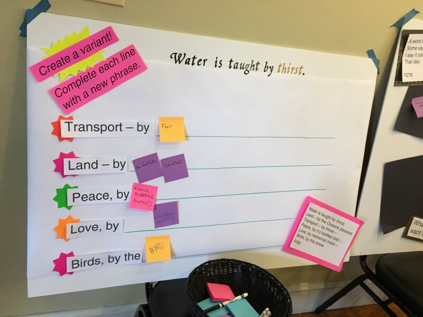 This was my favorite activity brought by the Emily Dickinson Museum, which plays with Dickinson’s habit of using variants in her poetry (lines where there are options for more than one word to fill out the thought), and invites attendees to add their own variants to her poem “Water is taught by thirst.” I added “the return of dawn” as a variant to “Birds, by the….”
