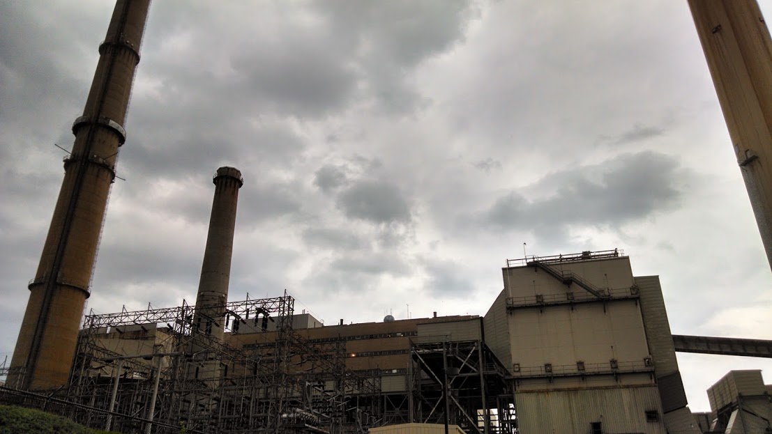 Thunderclouds gloom over the quiet power plant. Photo by me.